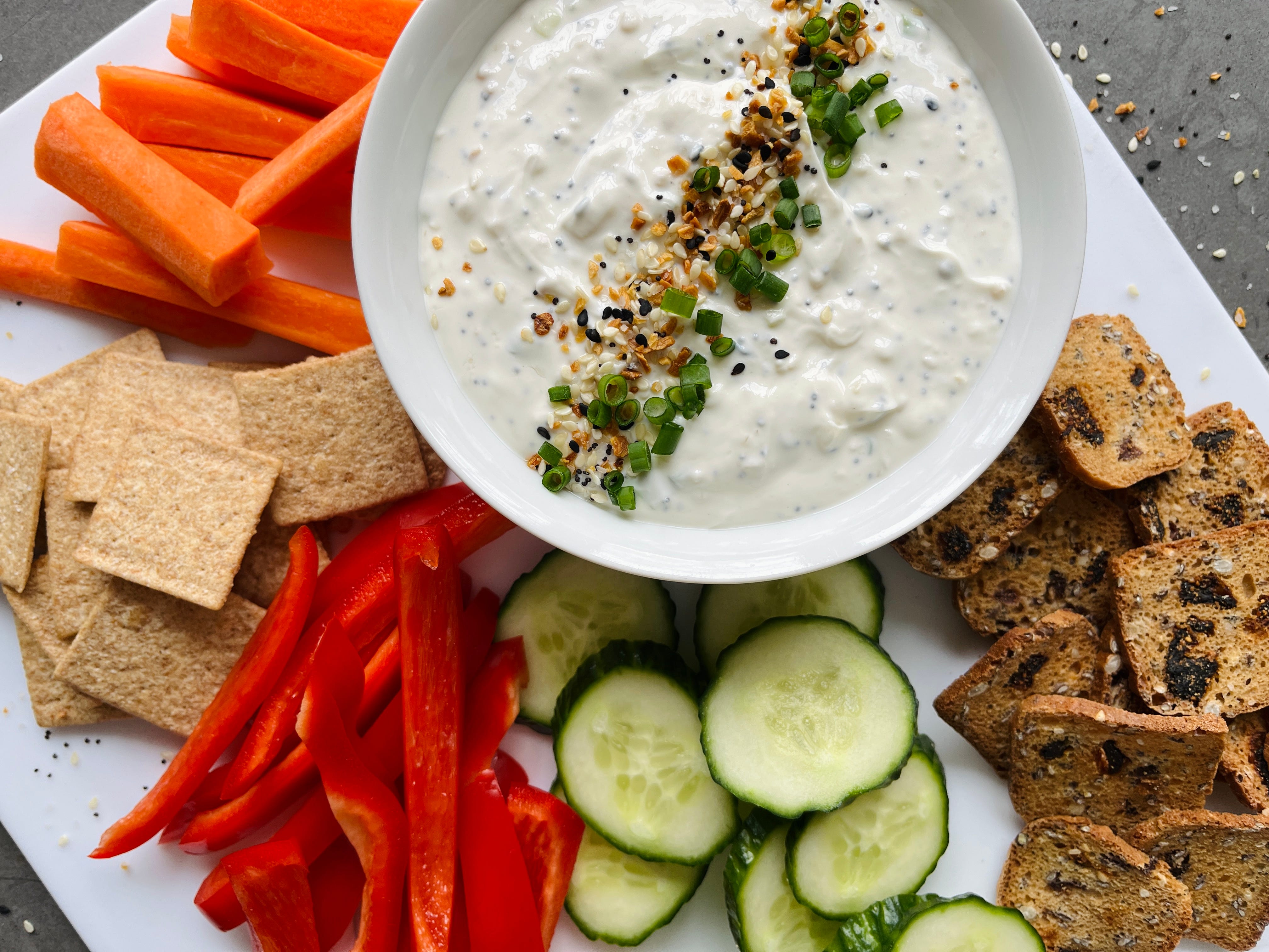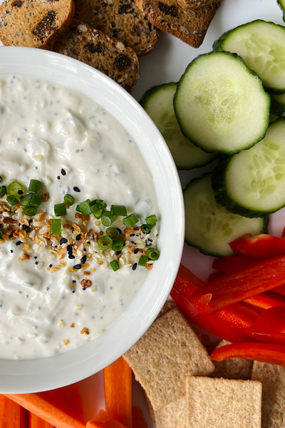 Transfer dip to a container, cover and refrigerate at least 1 hour (or overnight for maximum flavor), allowing flavors to blend. When ready to serve, stir dip well, place it in a serving bowl, and garnish with reserved 1/2 teaspoon everything bagel seasoning and sliced green onion. This dip is great with fresh vegetables, whole-grain crackers, pita wedges, or pretzel crisps.