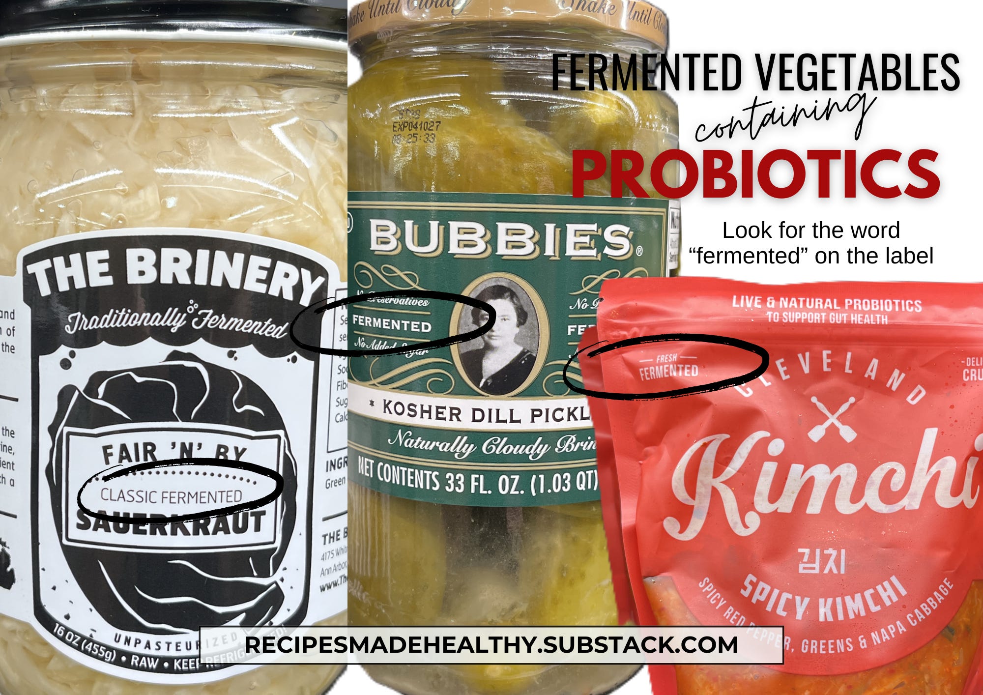 Fermented vegetables: sauerkraut, kimchi, and pickles. Look for these fermented vegetables in the refrigerated section of the grocery store. Those containing probiotics will have the word “fermented” on the label. If you haven’t had these fermented vegetables before, their smell and taste can be quite strong and rather unpleasant for some people.